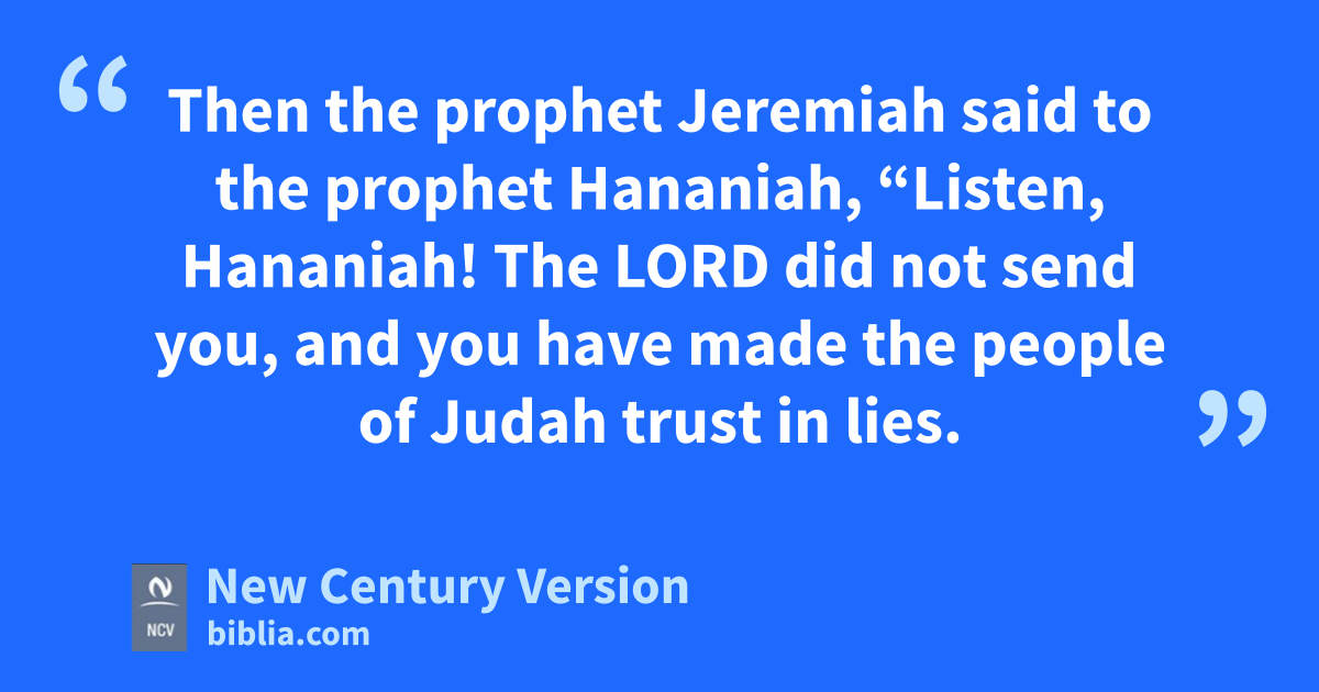 15 Then the prophet Jeremiah said to the prophet Hananiah, “Listen, Hananiah! The Lord did not send you, and you have made the people of Judah trust in lies. 16 So this is what the Lord says: ‘Soon I will remove you from the earth. You will die this year, because you taught the people to turn against the Lord.’ ”