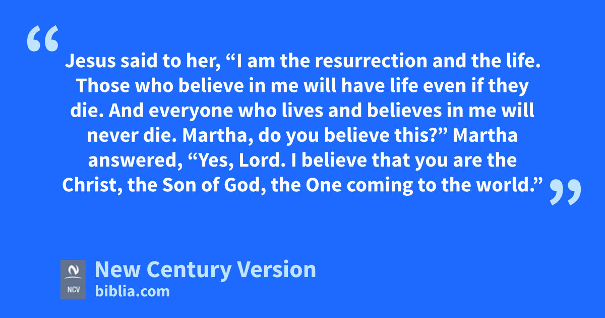 25 Jesus said to her, “I am the resurrection and the life. Those who believe in me will have life even if they die. 26 And everyone who lives and believes in me will never die. Martha, do you believe this?”