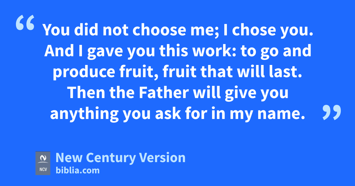 12 “This is my command: Love each other as I have loved you. 13 The greatest love a person can show is to die for his friends. 14 You are my friends if you do what I command you. 15 I no longer call you servants, because a servant does not know what his master is doing. But I call you friends, because I have made known to you everything I heard from my Father. 16 You did not choose me; I chose you. And I gave you this work: to go and produce fruit, fruit that will last. Then the Father will give you anything you ask for in my name. 17 This is my command: Love each other.