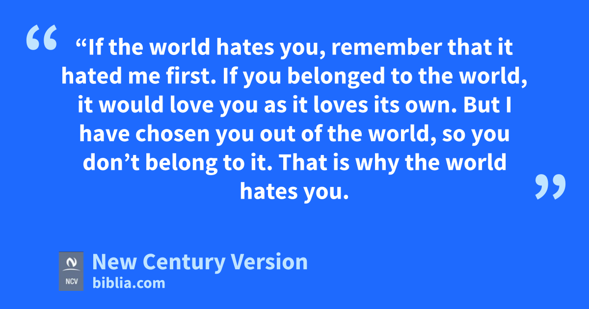 18 “If the world hates you, remember that it hated me first. 19 If you belonged to the world, it would love you as it loves its own. But I have chosen you out of the world, so you don’t belong to it. That is why the world hates you. 20 Remember what I told you: A servant is not greater than his master. If people did wrong to me, they will do wrong to you, too. And if they obeyed my teaching, they will obey yours, too. 21 They will do all this to you on account of me, because they do not know the One who sent me. 22 If I had not come and spoken to them, they would not be guilty of sin, but now they have no excuse for their sin. 23 Whoever hates me also hates my Father. 24 I did works among them that no one else has ever done. If I had not done these works, they would not be guilty of sin. But now they have seen what I have done, and yet they have hated both me and my Father. 25 But this happened so that what is written in their law would be true: ‘They hated me for no reason.’ n