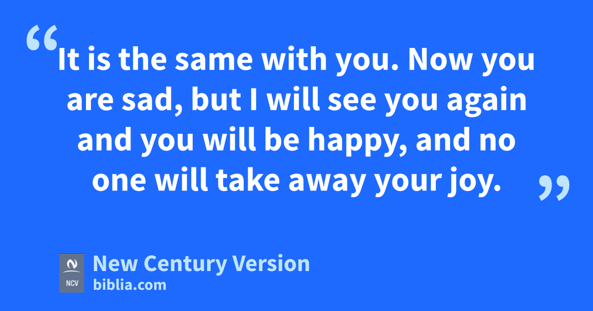 19 Jesus saw that the followers wanted to ask him about this, so he said to them, “Are you asking each other what I meant when I said, ‘After a little while you will not see me, and then after a little while you will see me again’? 20 I tell you the truth, you will cry and be sad, but the world will be happy. You will be sad, but your sadness will become joy. 21 When a woman gives birth to a baby, she has pain, because her time has come. But when her baby is born, she forgets the pain, because she is so happy that a child has been born into the world. 22 It is the same with you. Now you are sad, but I will see you again and you will be happy, and no one will take away your joy. 23 In that day you will not ask me for anything. I tell you the truth, my Father will give you anything you ask for in my name. 24 Until now you have not asked for anything in my name. Ask and you will receive, so that your joy will be the fullest possible joy.