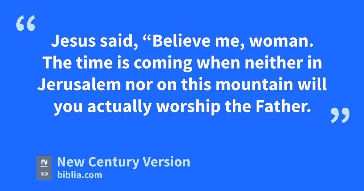 21 Jesus said, “Believe me, woman. The time is coming when neither in Jerusalem nor on this mountain will you actually worship the Father. 22 You Samaritans worship something you don’t understand. We understand what we worship, because salvation comes from the Jews. 23 The time is coming when the true worshipers will worship the Father in spirit and truth, and that time is here already. You see, the Father too is actively seeking such people to worship him. 24 God is spirit, and those who worship him must worship in spirit and truth.”