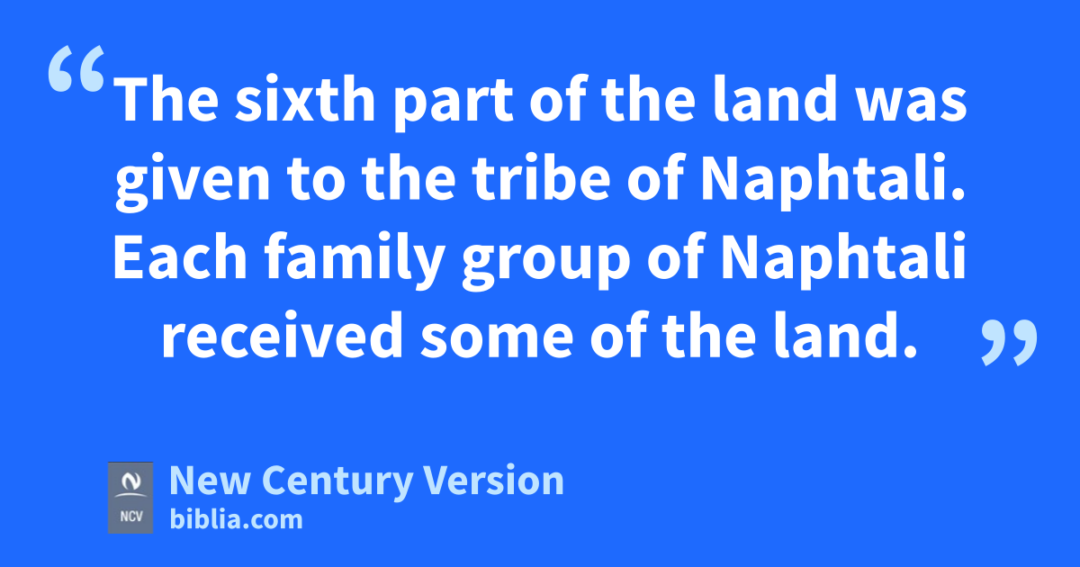 32 The sixth part of the land was given to the tribe of Naphtali. Each family group of Naphtali received some of the land. 33 The border of their land started at the large tree in Zaanannim, which is near Heleph. Then it went through Adami Nekeb and Jabneel, as far as Lakkum, and ended at the Jordan River. 34 Then it went to the west through Aznoth Tabor and stopped at Hukkok. It went to the area of Zebulun on the south, Asher on the west, and Judah, at the Jordan River, on the east. 35 The strong, walled cities inside these borders were called Ziddim, Zer, Hammath, Rakkath, Kinnereth, 36 Adamah, Ramah, Hazor, 37 Kedesh, Edrei, En Hazor, 38 Iron, Migdal El, Horem, Beth Anath, and Beth Shemesh. There were nineteen towns and all their villages.