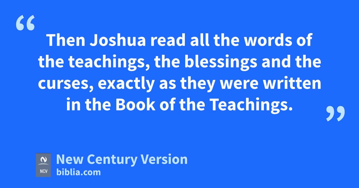 34 Then Joshua read all the words of the teachings, the blessings and the curses, exactly as they were written in the Book of the Teachings. 35 All the Israelites were gathered together—men, women, and children—along with the non-Israelites who lived among them. Joshua read every command that Moses had given.