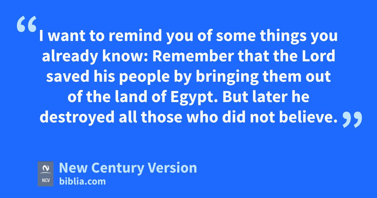 5 I want to remind you of some things you already know: Remember that the Lord n saved his people by bringing them out of the land of Egypt. But later he destroyed all those who did not believe. 6 And remember the angels who did not keep their place of power but left their proper home. The Lord has kept these angels in darkness, bound with everlasting chains, to be judged on the great day. 7 Also remember the cities of Sodom and Gomorrah n and the other towns around them. In the same way they were full of sexual sin and people who desired sexual relations that God does not allow. They suffer the punishment of eternal fire, as an example for all to see.
