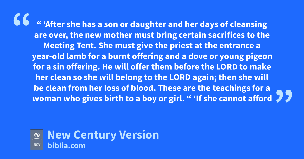 6 “ ‘After she has a son or daughter and her days of cleansing are over, the new mother must bring certain sacrifices to the Meeting Tent. She must give the priest at the entrance a year-old lamb for a burnt offering and a dove or young pigeon for a sin offering. 7 He will offer them before the Lord to make her clean so she will belong to the Lord again; then she will be clean from her loss of blood. These are the teachings for a woman who gives birth to a boy or girl.