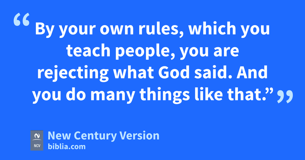 9 Then Jesus said to them, “You cleverly ignore the commands of God so you can follow your own teachings. 10 Moses said, ‘Honor your father and your mother,’ n and ‘Anyone who says cruel things to his father or mother must be put to death.’ n 11 But you say a person can tell his father or mother, ‘I have something I could use to help you, but it is Corban—a gift to God.’ 12 You no longer let that person use that money for his father or his mother. 13 By your own rules, which you teach people, you are rejecting what God said. And you do many things like that.”