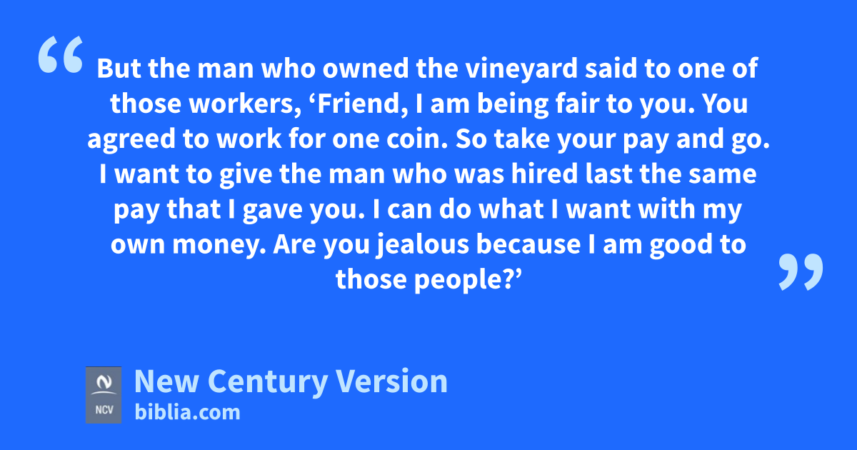 9 “When the workers who were hired at five o’clock came to get their pay, each received one coin. 10 When the workers who were hired first came to get their pay, they thought they would be paid more than the others. But each one of them also received one coin. 11 When they got their coin, they complained to the man who owned the land. 12 They said, ‘Those people were hired last and worked only one hour. But you paid them the same as you paid us who worked hard all day in the hot sun.’ 13 But the man who owned the vineyard said to one of those workers, ‘Friend, I am being fair to you. You agreed to work for one coin. 14 So take your pay and go. I want to give the man who was hired last the same pay that I gave you. 15 I can do what I want with my own money. Are you jealous because I am good to those people?’