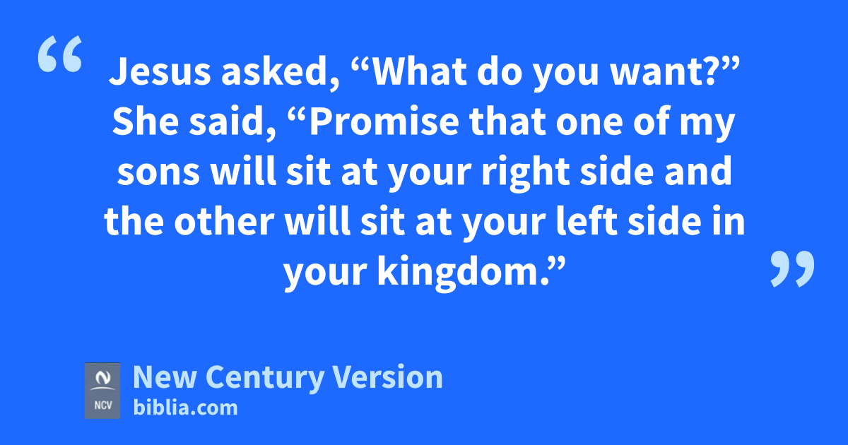 She said, “Promise that one of my sons will sit at your right side and the other will sit at your left side in your kingdom.”