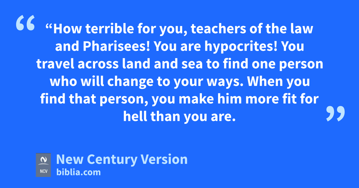 15 “How terrible for you, teachers of the law and Pharisees! You are hypocrites! You travel across land and sea to find one person who will change to your ways. When you find that person, you make him more fit for hell than you are.