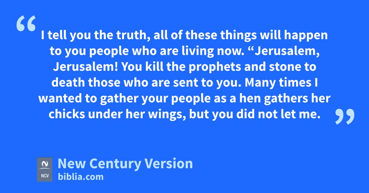 37 “Jerusalem, Jerusalem! You kill the prophets and stone to death those who are sent to you. Many times I wanted to gather your people as a hen gathers her chicks under her wings, but you did not let me.38 Now your house will be left completely empty. 39 I tell you, you will not see me again until that time when you will say, ‘God bless the One who comes in the name of the Lord.’ ” n