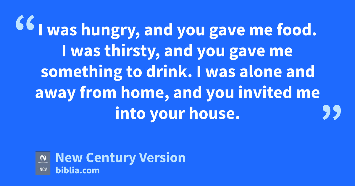 34 “Then the King will say to the people on his right, ‘Come, my Father has given you his blessing. Receive the kingdom God has prepared for you since the world was made. 35 I was hungry, and you gave me food. I was thirsty, and you gave me something to drink. I was alone and away from home, and you invited me into your house. 36 I was without clothes, and you gave me something to wear. I was sick, and you cared for me. I was in prison, and you visited me.’