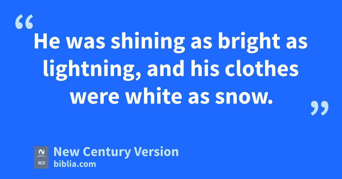 2 At that time there was a strong earthquake. An angel of the Lord came down from heaven, went to the tomb, and rolled the stone away from the entrance. Then he sat on the stone. 3 He was shining as bright as lightning, and his clothes were white as snow. 4 The soldiers guarding the tomb shook with fear because of the angel, and they became like dead men.