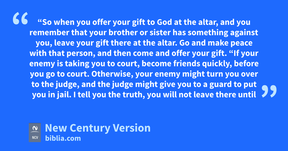 23 “So when you offer your gift to God at the altar, and you remember that your brother or sister has something against you, 24 leave your gift there at the altar. Go and make peace with that person, and then come and offer your gift.
