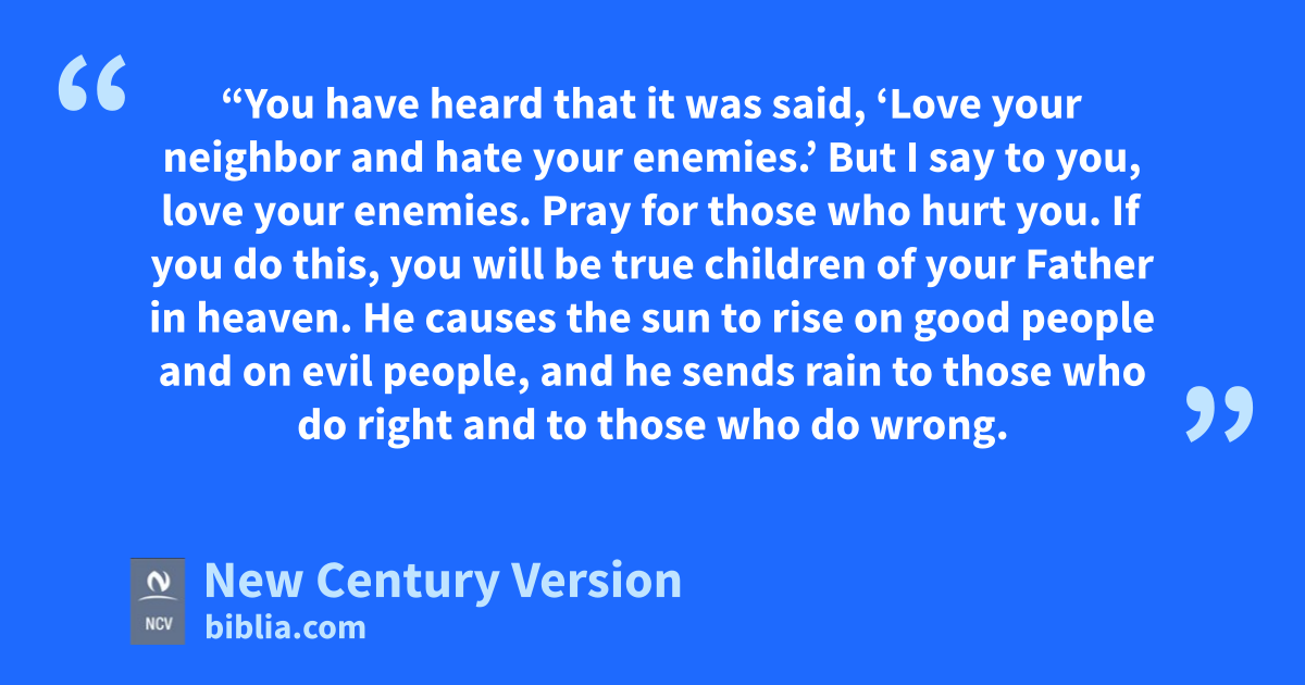 43 “You have heard that it was said, ‘Love your neighbor n and hate your enemies.’ 44 But I say to you, love your enemies. Pray for those who hurt you. n 45 If you do this, you will be true children of your Father in heaven. He causes the sun to rise on good people and on evil people, and he sends rain to those who do right and to those who do wrong. 46 If you love only the people who love you, you will get no reward. Even the tax collectors do that. 47 And if you are nice only to your friends, you are no better than other people. Even those who don’t know God are nice to their friends. 48 So you must be perfect, just as your Father in heaven is perfect.