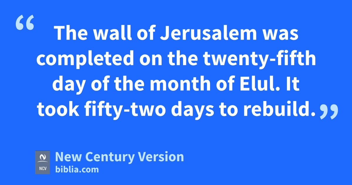 15 The wall of Jerusalem was completed on the twenty-fifth day of the month of Elul. It took fifty-two days to rebuild. 16 When all our enemies heard about it and all the nations around us saw it, they were shamed. They then understood that the work had been done with the help of our God.