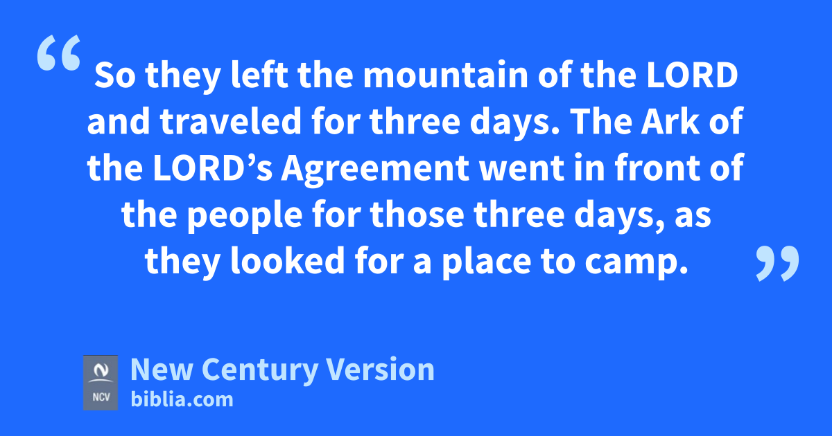31 But Moses said, “Please don’t leave us. You know where we can camp in the desert, and you can be our guide. 32 Come with us. We will share with you all the good things the Lord gives us.” 33 So they left the mountain of the Lord and traveled for three days. The Ark of the Lord’s Agreement went in front of the people for those three days, as they looked for a place to camp. 34 The Lord’s cloud was over them during the day when they left their camp.