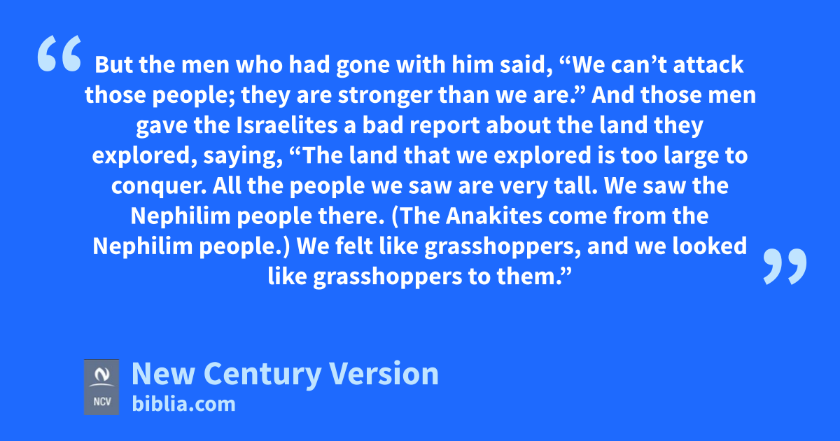 31 But the men who had gone with him said, “We can’t attack those people; they are stronger than we are.” 32 And those men gave the Israelites a bad report about the land they explored, saying, “The land that we explored is too large to conquer. All the people we saw are very tall. 33 We saw the Nephilim people there. (The Anakites come from the Nephilim people.) We felt like grasshoppers, and we looked like grasshoppers to them.”