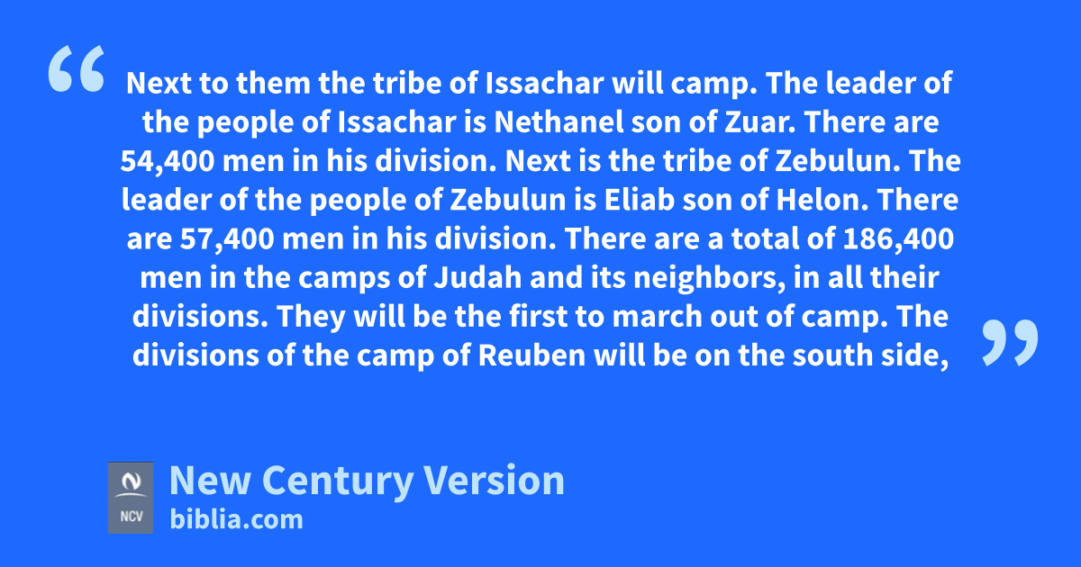 5 Next to them the tribe of Issachar will camp. The leader of the people of Issachar is Nethanel son of Zuar. 6 There are 54,400 men in his division.