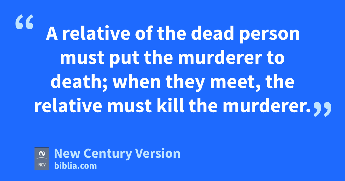 16 “ ‘Anyone who uses an iron weapon to kill someone is a murderer. He must be put to death. 17 Anyone who takes a rock and kills a person with it is a murderer. He must be put to death. 18 Anyone who picks up a piece of wood and kills someone with it is a murderer. He must be put to death. 19 A relative of the dead person must put the murderer to death; when they meet, the relative must kill the murderer. 20 A person might shove someone or throw something at someone and cause death. 21 Or a person might hit someone with his hand and cause death. If it were done from hate, the person is a murderer and must be put to death. A relative of the dead person must kill the murderer when they meet.