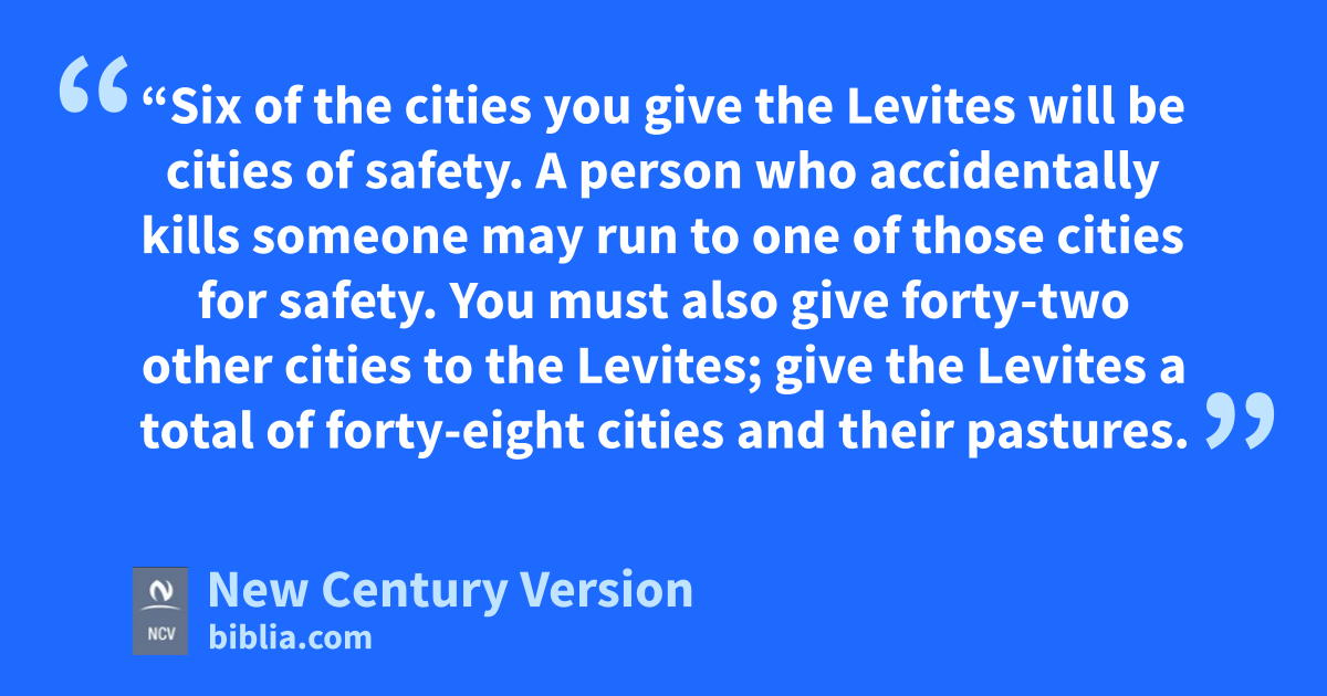 6 “Six of the cities you give the Levites will be cities of safety. A person who accidentally kills someone may run to one of those cities for safety. You must also give forty-two other cities to the Levites; 7 give the Levites a total of forty-eight cities and their pastures. 8 The larger tribes of Israel must give more cities, and the smaller tribes must give fewer cities. Each tribe must give some of its cities to the Levites, but the number of cities they give will depend on the size of their land.”