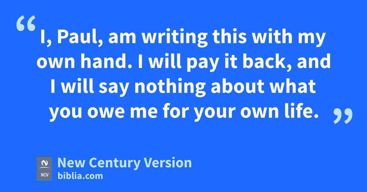 17 So if you consider me your partner, welcome Onesimus as you would welcome me. 18 If he has done anything wrong to you or if he owes you anything, charge that to me. 19 I, Paul, am writing this with my own hand. I will pay it back, and I will say nothing about what you owe me for your own life. 20 So, my brother, I ask that you do this for me in the Lord: Refresh my heart in Christ. 21 I write this letter, knowing that you will do what I ask you and even more.