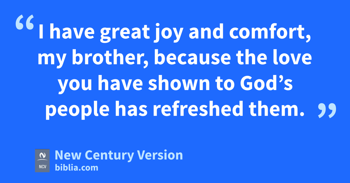 4 I always thank my God when I mention you in my prayers, 5 because I hear about the love you have for all God’s holy people and the faith you have in the Lord Jesus. 6 I pray that the faith you share may make you understand every blessing we have in Christ. 7 I have great joy and comfort, my brother, because the love you have shown to God’s people has refreshed them.