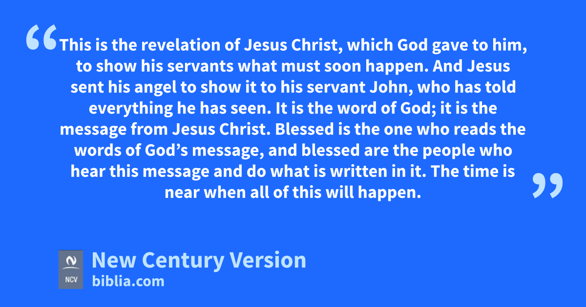 1 This is the revelation n of Jesus Christ, which God gave to him, to show his servants what must soon happen. And Jesus sent his angel to show it to his servant John, 2 who has told everything he has seen. It is the word of God; it is the message from Jesus Christ. 3 Blessed is the one who reads the words of God’s message, and blessed are the people who hear this message and do what is written in it. The time is near when all of this will happen.