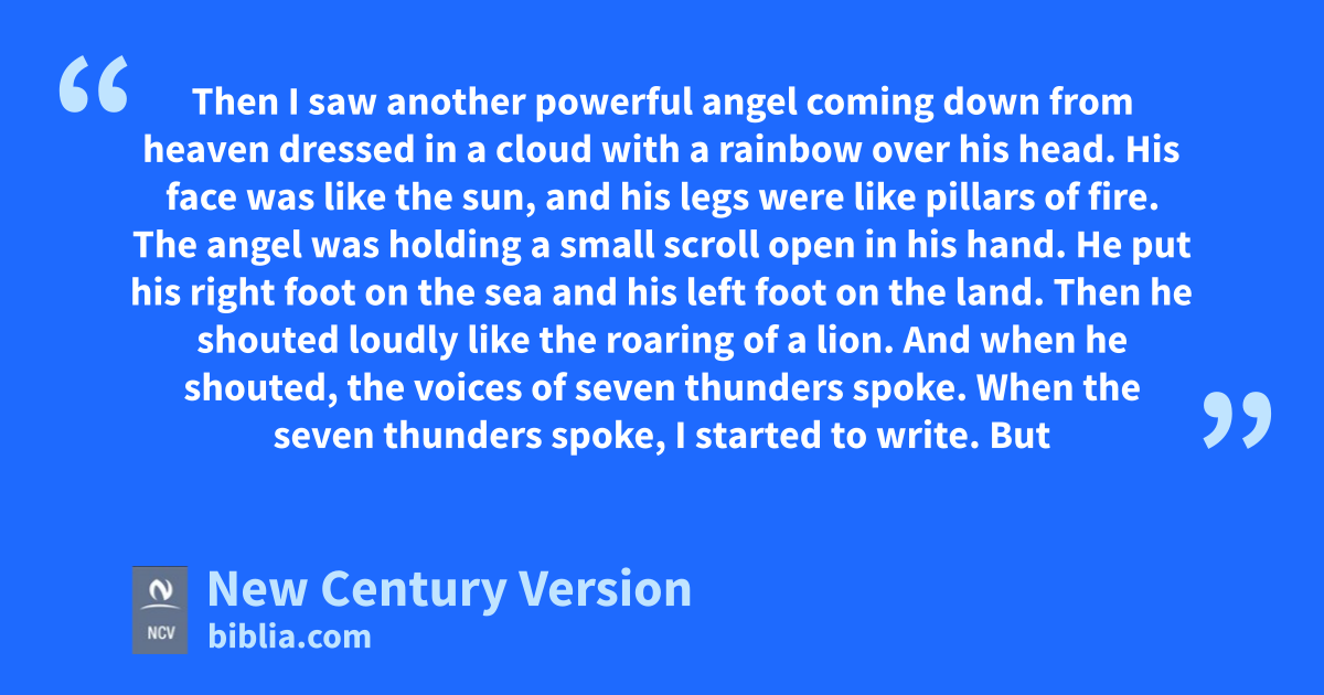 10 Then I saw another powerful angel coming down from heaven dressed in a cloud with a rainbow over his head. His face was like the sun, and his legs were like pillars of fire. 2 The angel was holding a small scroll open in his hand. He put his right foot on the sea and his left foot on the land. 3 Then he shouted loudly like the roaring of a lion. And when he shouted, the voices of seven thunders spoke. 4 When the seven thunders spoke, I started to write. But I heard a voice from heaven say, “Keep hidden what the seven thunders said, and do not write them down.”