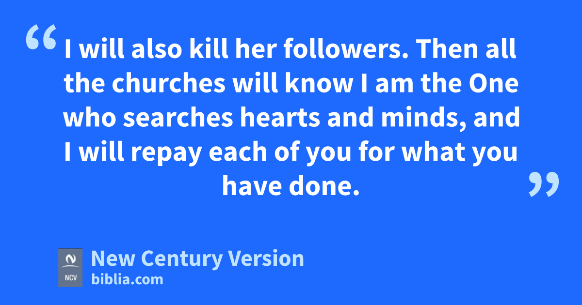 20 “But I have this against you: You let that woman Jezebel spread false teachings. She says she is a prophetess, but by her teaching she leads my people to take part in sexual sins and to eat food that is offered to idols. 21 I have given her time to change her heart and turn away from her sin, but she does not want to change. 22 So I will throw her on a bed of suffering. And all those who take part in adultery with her will suffer greatly if they do not turn away from the wrongs she does. 23 I will also kill her followers. Then all the churches will know I am the One who searches hearts and minds, and I will repay each of you for what you have done.