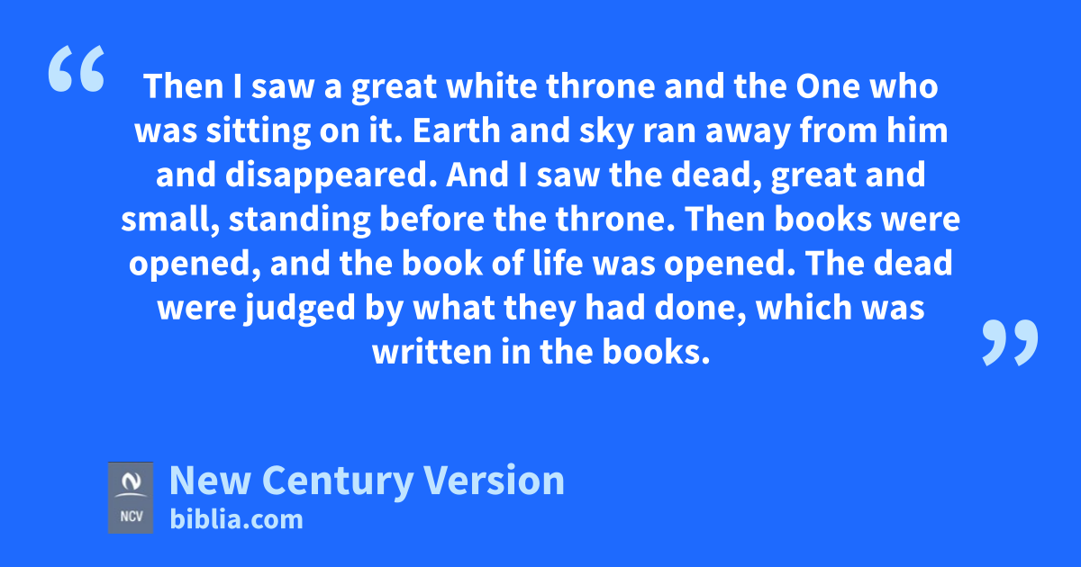 11 Then I saw a great white throne and the One who was sitting on it. Earth and sky ran away from him and disappeared. 12 And I saw the dead, great and small, standing before the throne. Then books were opened, and the book of life was opened. The dead were judged by what they had done, which was written in the books. 13 The sea gave up the dead who were in it, and Death and Hades n gave up the dead who were in them. Each person was judged by what he had done. 14 And Death and Hades were thrown into the lake of fire. The lake of fire is the second death. 15 And anyone whose name was not found written in the book of life was thrown into the lake of fire.