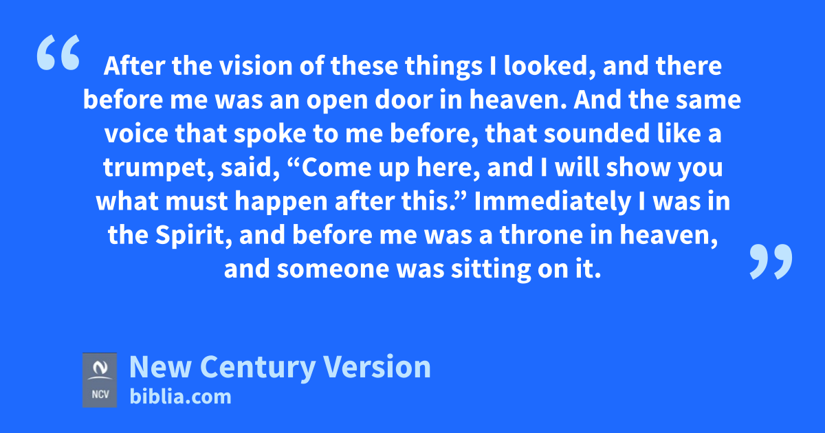 4 After the vision of these things I looked, and there before me was an open door in heaven. And the same voice that spoke to me before, that sounded like a trumpet, said, “Come up here, and I will show you what must happen after this.” 2 Immediately I was in the Spirit, and before me was a throne in heaven, and someone was sitting on it. 3 The One who sat on the throne looked like precious stones, like jasper and carnelian. All around the throne was a rainbow the color of an emerald. 4 Around the throne there were twenty-four other thrones with twenty-four elders sitting on them. They were dressed in white and had golden crowns on their heads. 5 Lightning flashes and noises and thunder came from the throne. Before the throne seven lamps were burning, which are the seven spirits of God. 6 Also before the throne there was something that looked like a sea of glass, clear like crystal.
