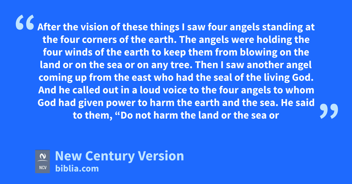 7 After the vision of these things I saw four angels standing at the four corners of the earth. The angels were holding the four winds of the earth to keep them from blowing on the land or on the sea or on any tree. 2 Then I saw another angel coming up from the east who had the seal of the living God. And he called out in a loud voice to the four angels to whom God had given power to harm the earth and the sea. 3 He said to them, “Do not harm the land or the sea or the trees until we mark with a sign the foreheads of the people who serve our God.” 4 Then I heard how many people were marked with the sign. There were one hundred forty-four thousand from every tribe of the people of Israel.