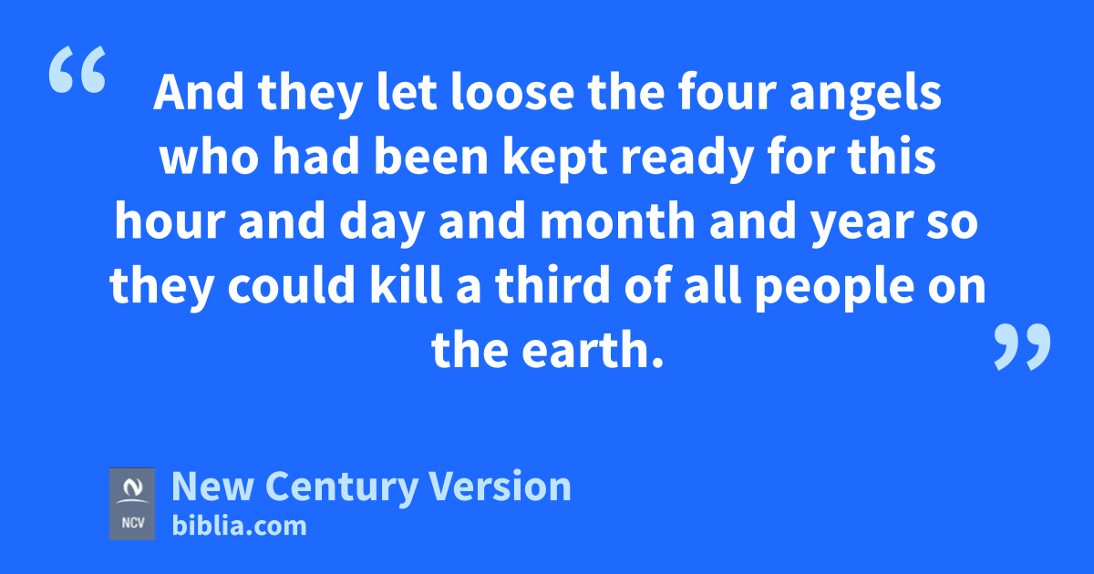 13 Then the sixth angel blew his trumpet, and I heard a voice coming from the horns on the golden altar that is before God. 14 The voice said to the sixth angel who had the trumpet, “Free the four angels who are tied at the great river Euphrates.” 15 And they let loose the four angels who had been kept ready for this hour and day and month and year so they could kill a third of all people on the earth. 16 I heard how many troops on horses were in their army—two hundred million.