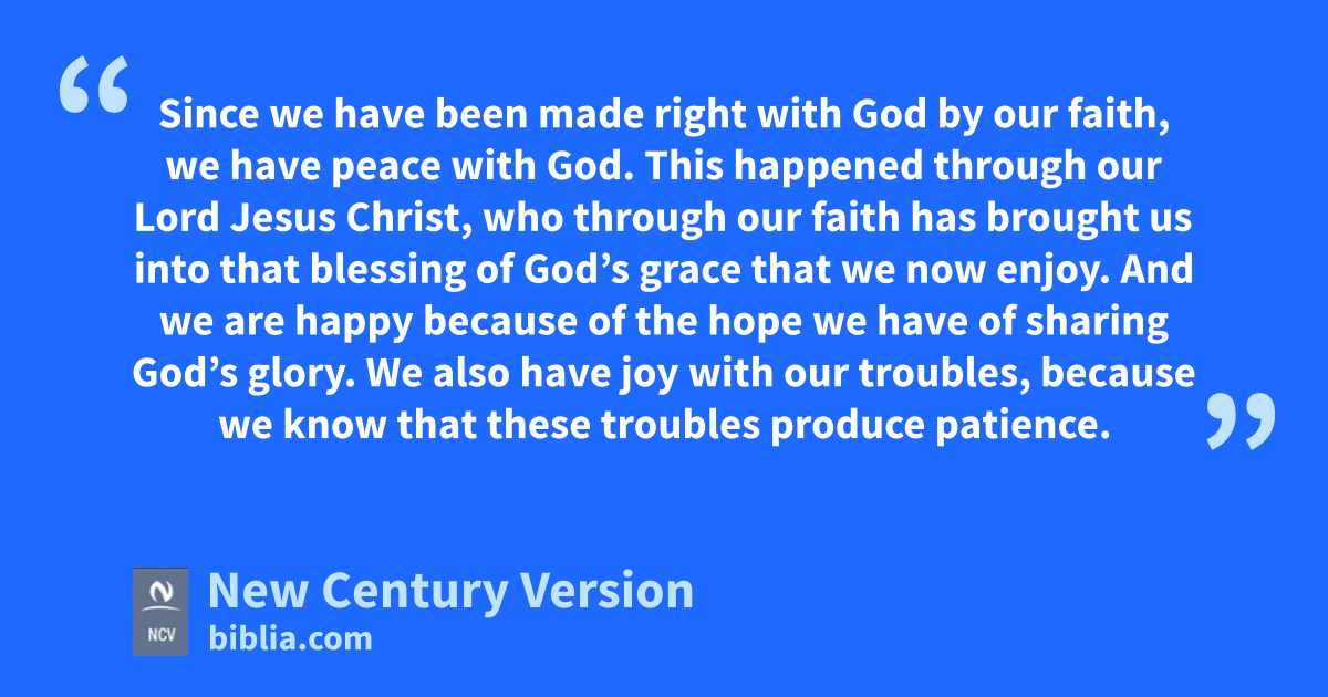 5 Since we have been made right with God by our faith, we have n peace with God. This happened through our Lord Jesus Christ, 2 who through our faith n has brought us into that blessing of God’s grace that we now enjoy. And we are happy because of the hope we have of sharing God’s glory. 3 We also have joy with our troubles, because we know that these troubles produce patience. 4 And patience produces character, and character produces hope. 5 And this hope will never disappoint us, because God has poured out his love to fill our hearts. He gave us his love through the Holy Spirit, whom God has given to us.