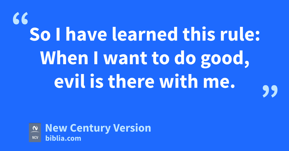 21 So I have learned this rule: When I want to do good, evil is there with me. 22 In my mind, I am happy with God’s law. 23 But I see another law working in my body, which makes war against the law that my mind accepts. That other law working in my body is the law of sin, and it makes me its prisoner. 24 What a miserable man I am! Who will save me from this body that brings me death? 25 I thank God for saving me through Jesus Christ our Lord!