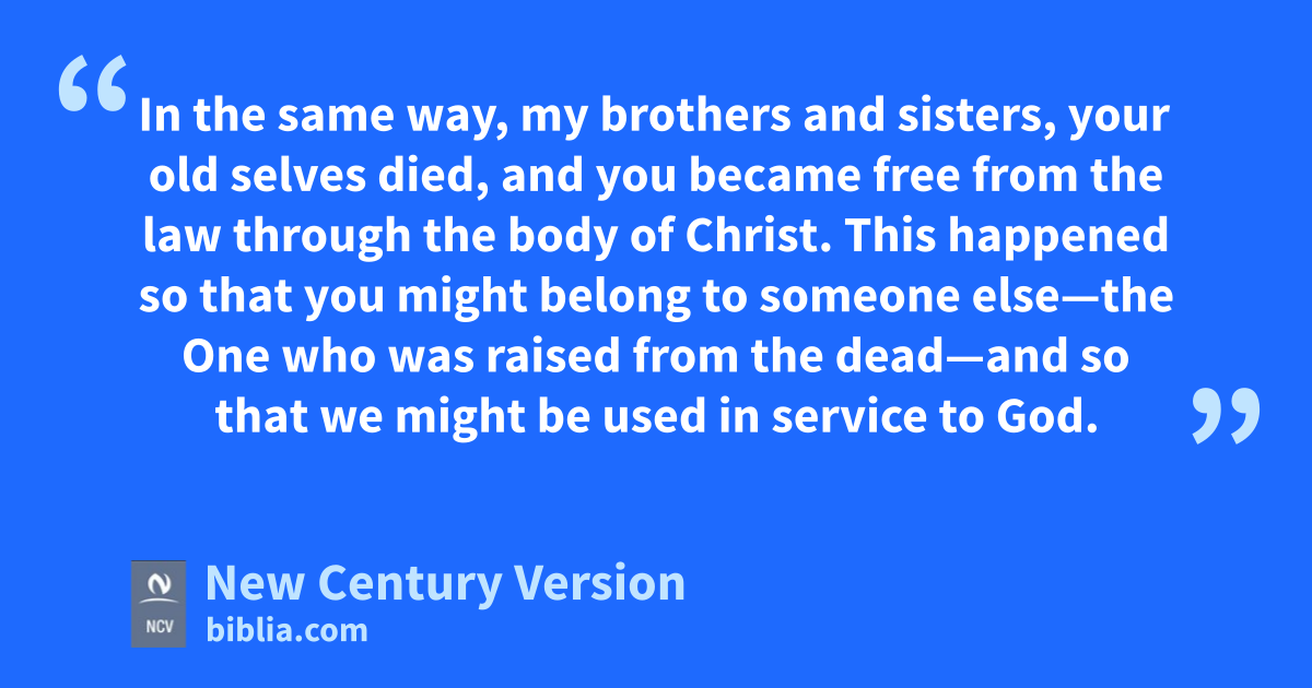4 In the same way, my brothers and sisters, your old selves died, and you became free from the law through the body of Christ. This happened so that you might belong to someone else—the One who was raised from the dead—and so that we might be used in service to God. 5 In the past, we were ruled by our sinful selves. The law made us want to do sinful things that controlled our bodies, so the things we did were bringing us death. 6 In the past, the law held us like prisoners, but our old selves died, and we were made free from the law. So now we serve God in a new way with the Spirit, and not in the old way with written rules.