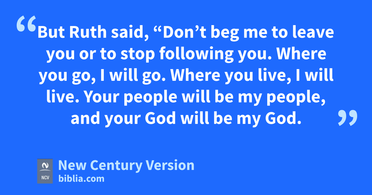 16 But Ruth said, “Don’t beg me to leave you or to stop following you. Where you go, I will go. Where you live, I will live. Your people will be my people, and your God will be my God. 17 And where you die, I will die, and there I will be buried. I ask the Lord to punish me terribly if I do not keep this promise: Not even death will separate us.”
