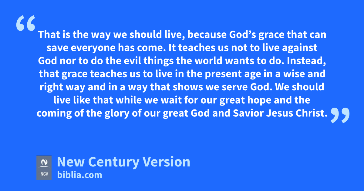 11 That is the way we should live, because God’s grace that can save everyone has come. 12 It teaches us not to live against God nor to do the evil things the world wants to do. Instead, that grace teaches us to live in the present age in a wise and right way and in a way that shows we serve God. 13 We should live like that while we wait for our great hope and the coming of the glory of our great God and Savior Jesus Christ. 14 He gave himself for us so he might pay the price to free us from all evil and to make us pure people who belong only to him—people who are always wanting to do good deeds.