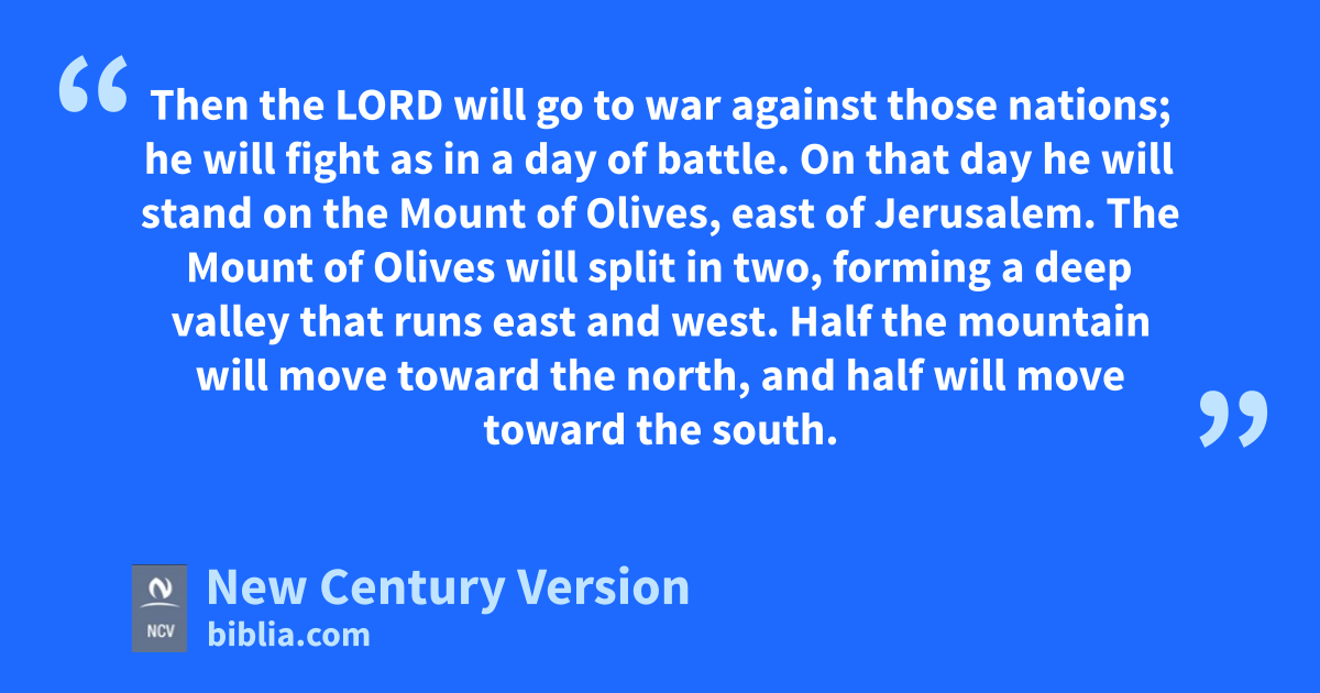 3 Then the Lord will go to war against those nations; he will fight as in a day of battle. 4 On that day he will stand on the Mount of Olives, east of Jerusalem. The Mount of Olives will split in two, forming a deep valley that runs east and west. Half the mountain will move toward the north, and half will move toward the south. 5 You will run through this mountain valley to the other side, just as you ran from the earthquake when Uzziah was king of Judah. Then the Lord my God will come and all the holy ones with him.
