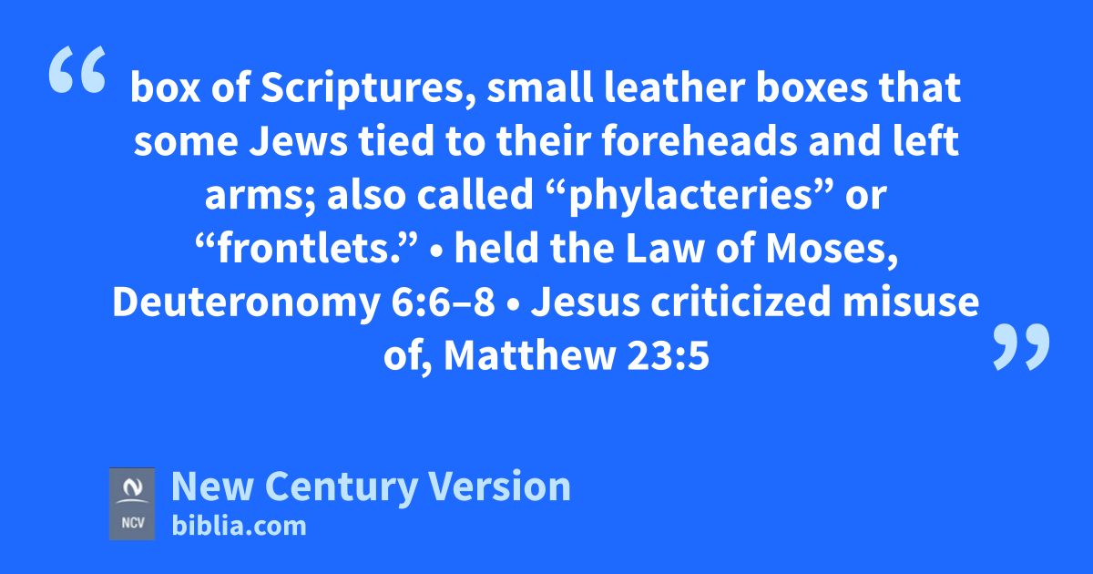 box of Scriptures, small leather boxes that some Jews tied to their foreheads and left arms; also called “phylacteries” or “frontlets.”
