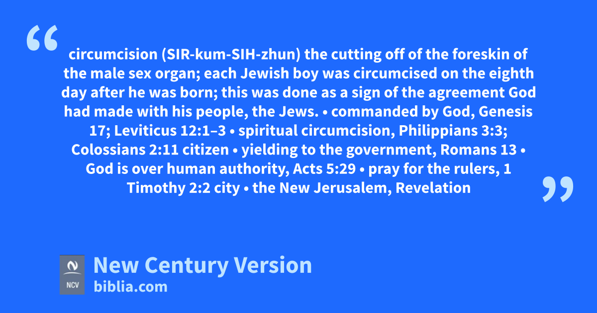 circumcision (SIR-kum-SIH-zhun) the cutting off of the foreskin of the male sex organ; each Jewish boy was circumcised on the eighth day after he was born; this was done as a sign of the agreement God had made with his people, the Jews.