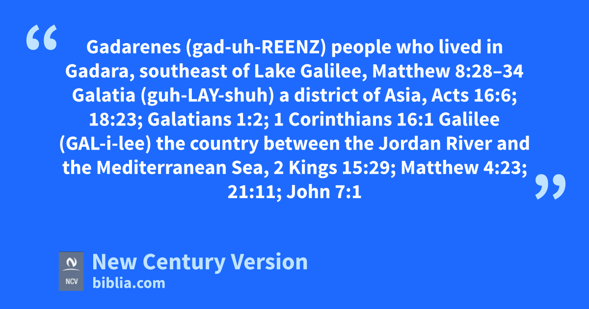 Gadarenes (gad-uh-REENZ) people who lived in Gadara, southeast of Lake Galilee, Matthew 8:28–34