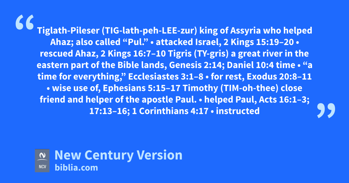 Tiglath-Pileser (TIG-lath-peh-LEE-zur) king of Assyria who helped Ahaz; also called “Pul.”