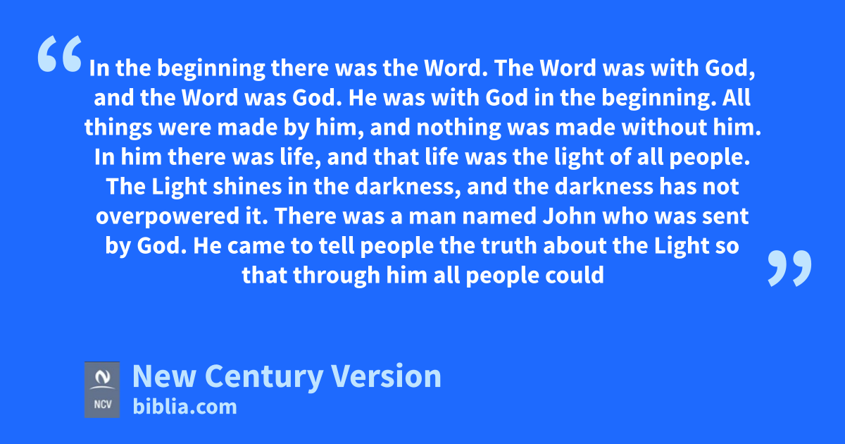 1 In the beginning there was the Word. n The Word was with God, and the Word was God. 2 He was with God in the beginning. 3 All things were made by him, and nothing was made without him. 4 In him there was life, and that life was the light of all people. 5 The Light shines in the darkness, and the darkness has not overpowered n it.