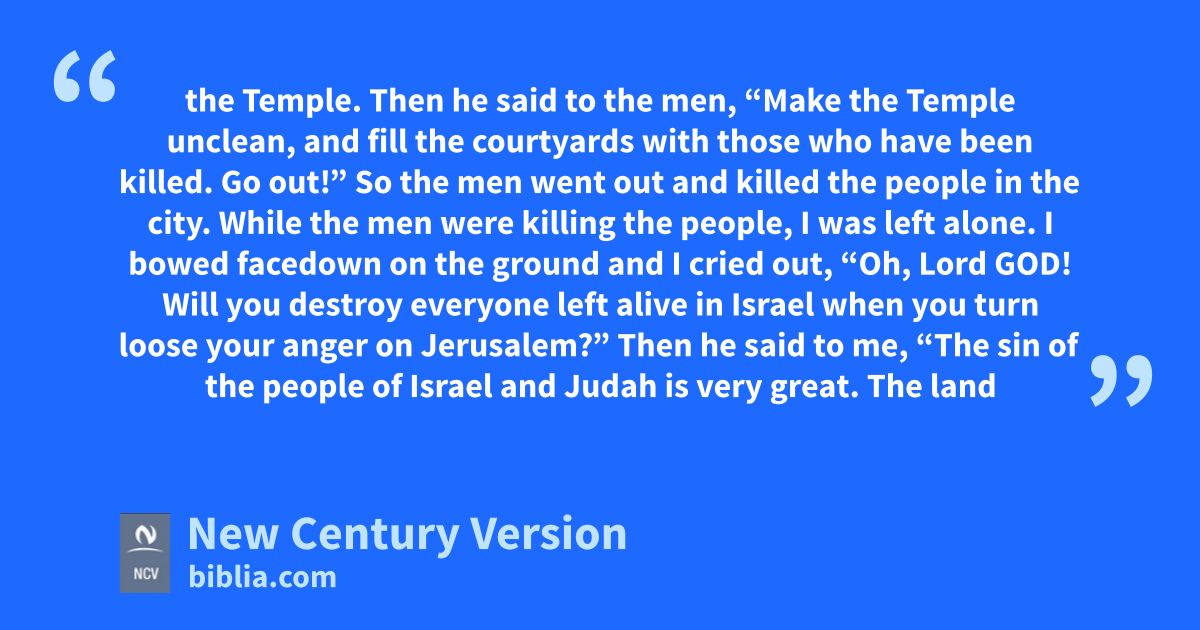 7 Then he said to the men, “Make the Temple unclean, and fill the courtyards with those who have been killed. Go out!” So the men went out and killed the people in the city. 8 While the men were killing the people, I was left alone. I bowed facedown on the ground and I cried out, “Oh, Lord God! Will you destroy everyone left alive in Israel when you turn loose your anger on Jerusalem?”