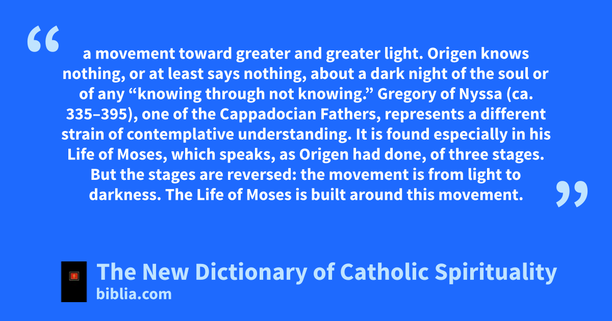a movement toward greater and greater light. Origen knows nothing, or at least says nothing, about a dark night of the soul or of any “knowing through not knowing.” Gregory of Nyssa (ca. 335–395), one of the Cappadocian Fathers, represents a different strain of contemplative understanding. It is found especially in his Life of Moses, which speaks, as Origen had done, of three stages. But the stages are reversed: the movement is from light to darkness. The Life of Moses is built around this movement.