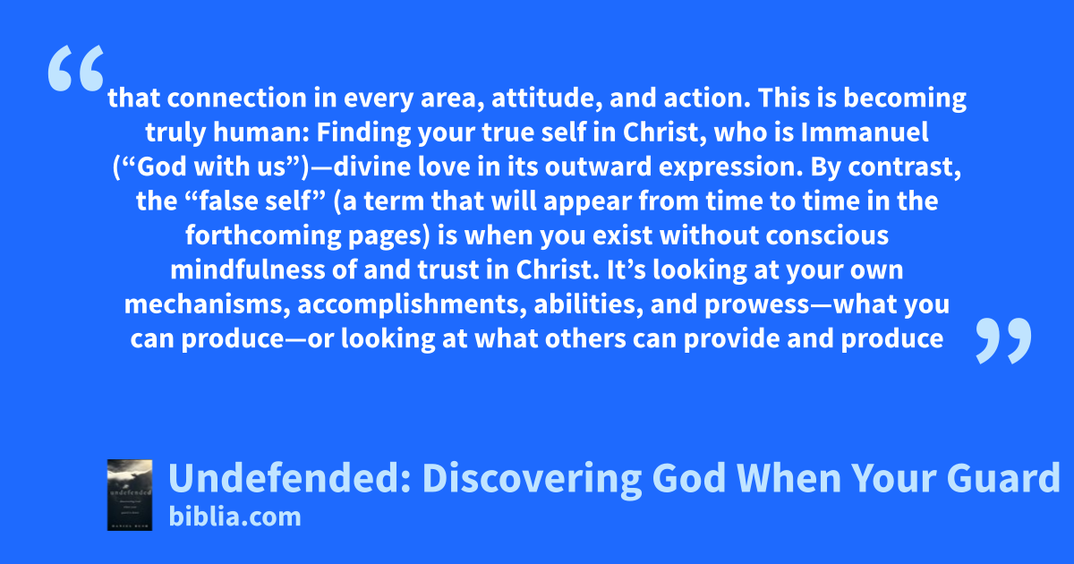 that connection in every area, attitude, and action. This is becoming truly human: Finding your true self in Christ, who is Immanuel (“God with us”)—divine love in its outward expression. By contrast, the “false self” (a term that will appear from time to time in the forthcoming pages) is when you exist without conscious mindfulness of and trust in Christ. It’s looking at your own mechanisms, accomplishments, abilities, and prowess—what you can produce—or looking at what others can provide and produce