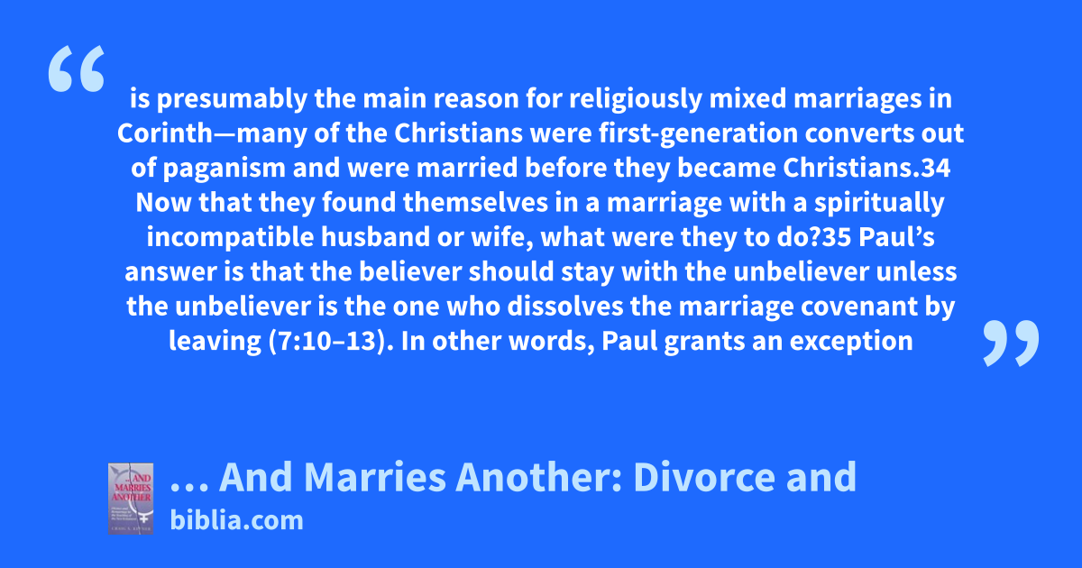 is presumably the main reason for religiously mixed marriages in Corinth—many of the Christians were first-generation converts out of paganism and were married before they became Christians.34 Now that they found themselves in a marriage with a spiritually incompatible husband or wife, what were they to do?35 Paul’s answer is that the believer should stay with the unbeliever unless the unbeliever is the one who dissolves the marriage covenant by leaving (7:10–13). In other words, Paul grants an exception