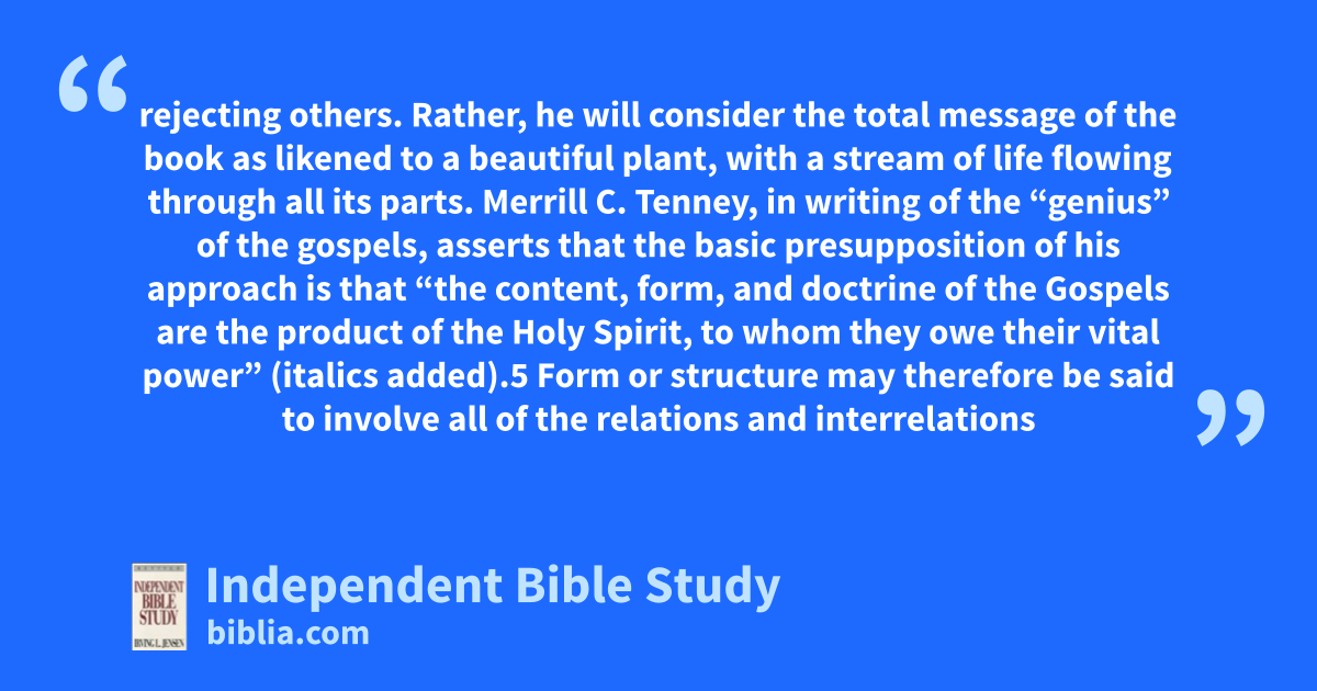 rejecting others. Rather, he will consider the total message of the book as likened to a beautiful plant, with a stream of life flowing through all its parts. Merrill C. Tenney, in writing of the “genius” of the gospels, asserts that the basic presupposition of his approach is that “the content, form, and doctrine of the Gospels are the product of the Holy Spirit, to whom they owe their vital power” (italics added).5 Form or structure may therefore be said to involve all of the relations and interrelations